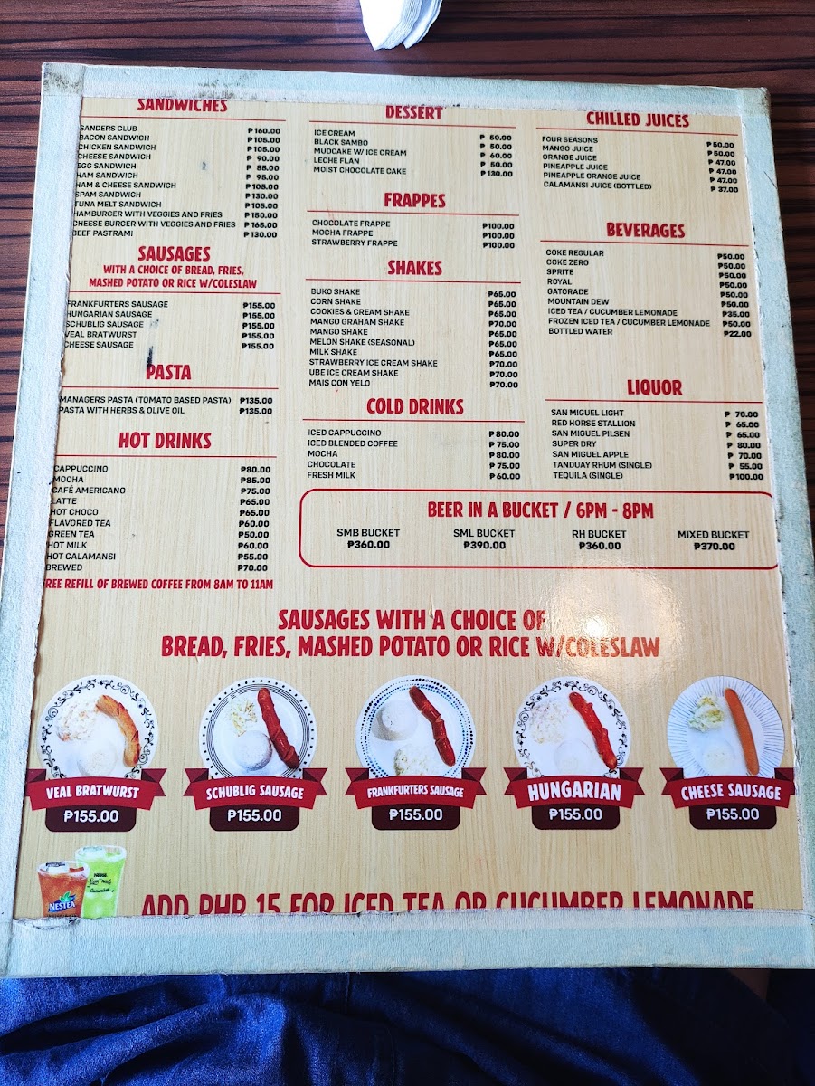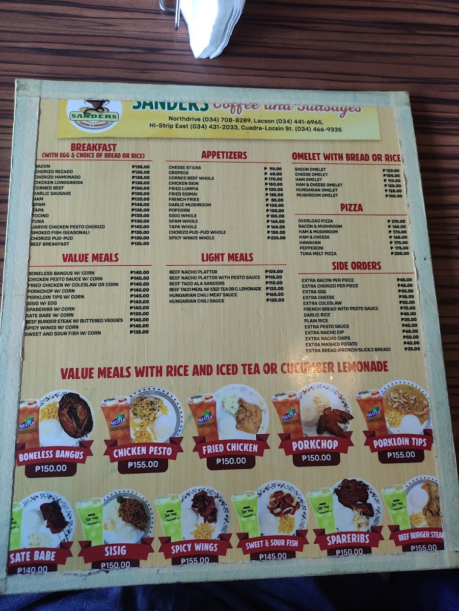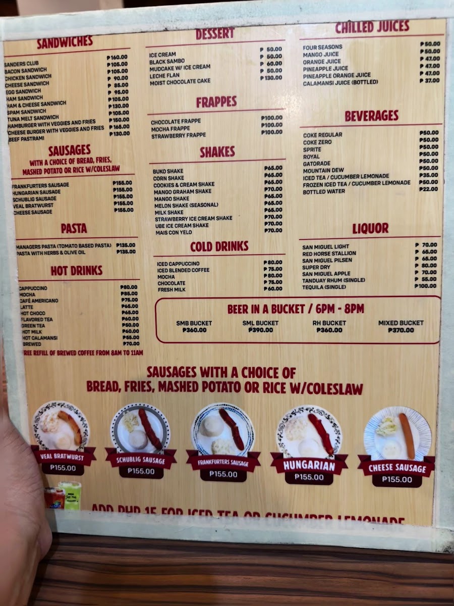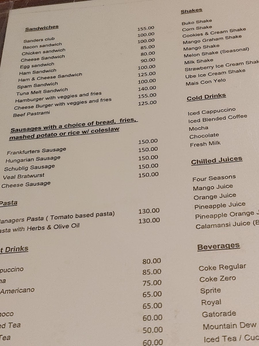 Sampling the menu at Sanders Coffee & Sausages East is a journey through both comfort food and indulgent treats. The Value Meals like Chicken Pesto Sauce With Corn, Pork Loin Tips With Corn, and Fried Chicken With CornSisig With Egg offer hearty, satisfying options, while Spicy Wings With Atchara delivers a punch of flavor. Breakfast enthusiasts will enjoy Tocino and a variety of Omelets-Bacon Omelet, Mushroom Omelet, Ham Omelet, and Cheese Omelet-perfectly paired with Plain Rice or Garlic Rice from the side orders. Sandwich lovers can choose from the classic Sanders Club, Ham Sandwich, or Bacon Sandwich, while those seeking lighter fare may opt for the Beef Nacho Platter With Pesto Sauce. Appetizers like Cropeck, Chicken Skin, Fried Lumpia, French Fries, and Cheese Sticks provide great sharable bites. Sweet cravings are easily satisfied with the dessert selections, particularly the Mud Cake With Ice Cream and Black Sambo. Shakes-Ube Ice Cream Shake, Milk Shake, Mango Shake, Melon Shake, and Buko Shake-and chilled juices including Pineapple Orange Juice, Mango Juice, Pineapple Juice, and Four Seasons offer refreshing complements. The beverage lineup rounds out with Frozen Cucumber Lemonade, sodas like Sprite, Coke Regular, and Royal, plus hot options including Hot Calamansi and Brewed coffee. For those enjoying a more spirited accompaniment, the liquor selection features San Miguel Light and Red Horse Stallion, while the Frankfurters Sausage stands out for a classic meat option. Value meals with rice and a drink, like Chicken Pesto Sauce With Corn, Spareribs, Sisig With Egg, and Beef Burger Steak With Buttered Veggies, provide both convenience and satisfaction, making this menu a versatile and approachable mix of traditional favorites and indulgent treats.