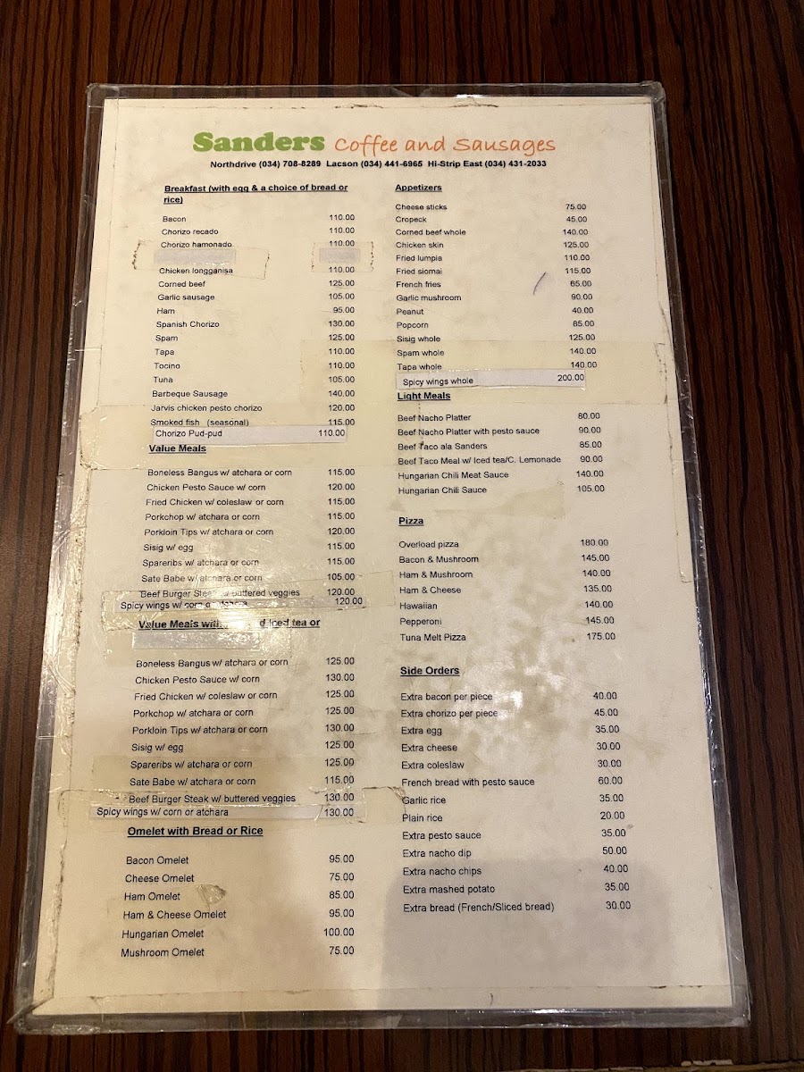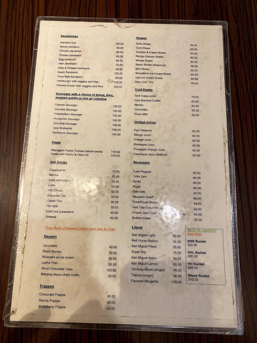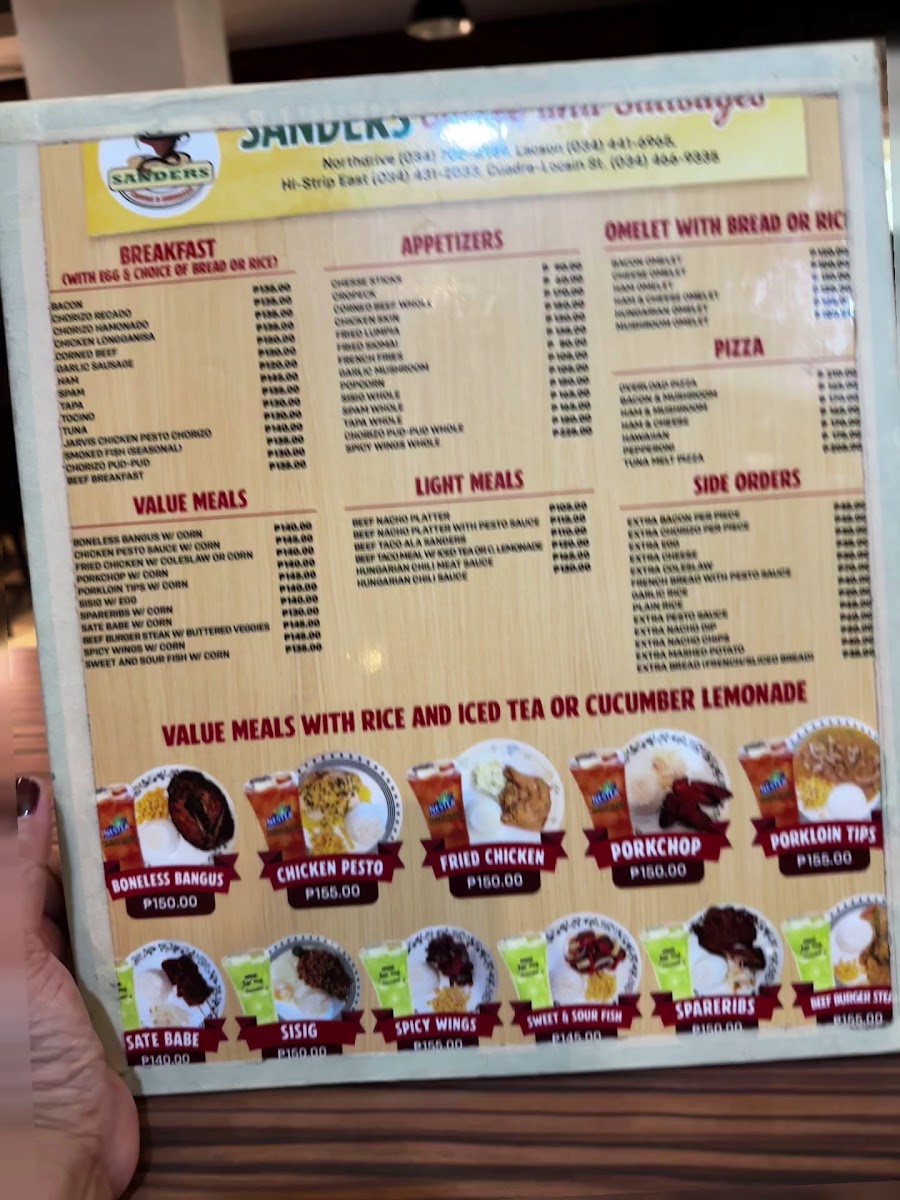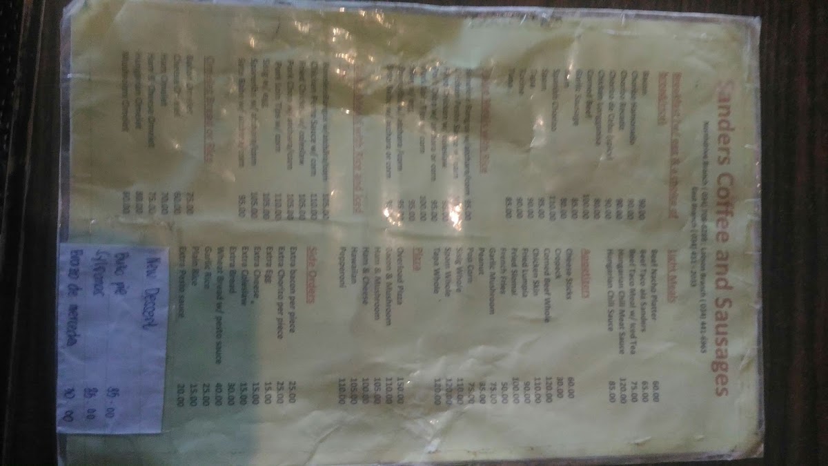 Sampling the menu at Sanders Coffee & Sausages East is a journey through both comfort food and indulgent treats. The Value Meals like Chicken Pesto Sauce With Corn, Pork Loin Tips With Corn, and Fried Chicken With CornSisig With Egg offer hearty, satisfying options, while Spicy Wings With Atchara delivers a punch of flavor. Breakfast enthusiasts will enjoy Tocino and a variety of Omelets-Bacon Omelet, Mushroom Omelet, Ham Omelet, and Cheese Omelet-perfectly paired with Plain Rice or Garlic Rice from the side orders. Sandwich lovers can choose from the classic Sanders Club, Ham Sandwich, or Bacon Sandwich, while those seeking lighter fare may opt for the Beef Nacho Platter With Pesto Sauce. Appetizers like Cropeck, Chicken Skin, Fried Lumpia, French Fries, and Cheese Sticks provide great sharable bites. Sweet cravings are easily satisfied with the dessert selections, particularly the Mud Cake With Ice Cream and Black Sambo. Shakes-Ube Ice Cream Shake, Milk Shake, Mango Shake, Melon Shake, and Buko Shake-and chilled juices including Pineapple Orange Juice, Mango Juice, Pineapple Juice, and Four Seasons offer refreshing complements. The beverage lineup rounds out with Frozen Cucumber Lemonade, sodas like Sprite, Coke Regular, and Royal, plus hot options including Hot Calamansi and Brewed coffee. For those enjoying a more spirited accompaniment, the liquor selection features San Miguel Light and Red Horse Stallion, while the Frankfurters Sausage stands out for a classic meat option. Value meals with rice and a drink, like Chicken Pesto Sauce With Corn, Spareribs, Sisig With Egg, and Beef Burger Steak With Buttered Veggies, provide both convenience and satisfaction, making this menu a versatile and approachable mix of traditional favorites and indulgent treats.